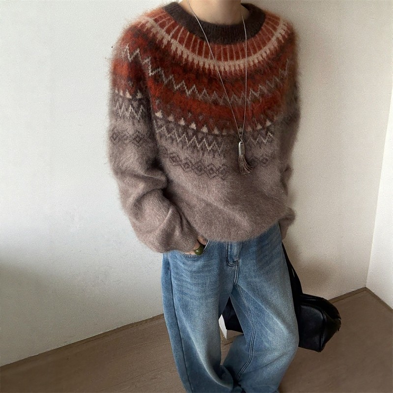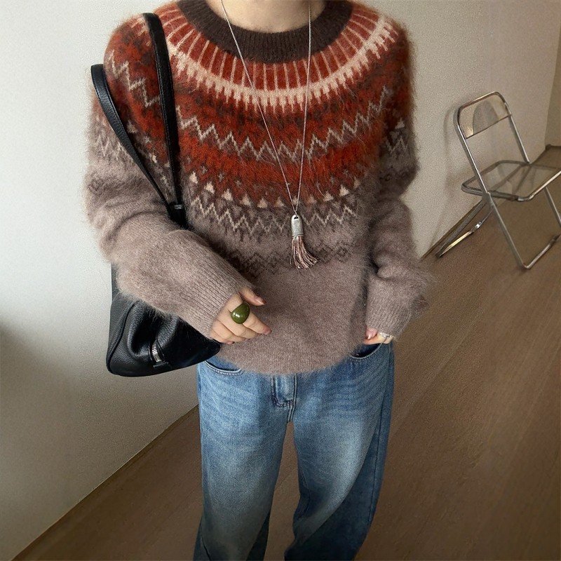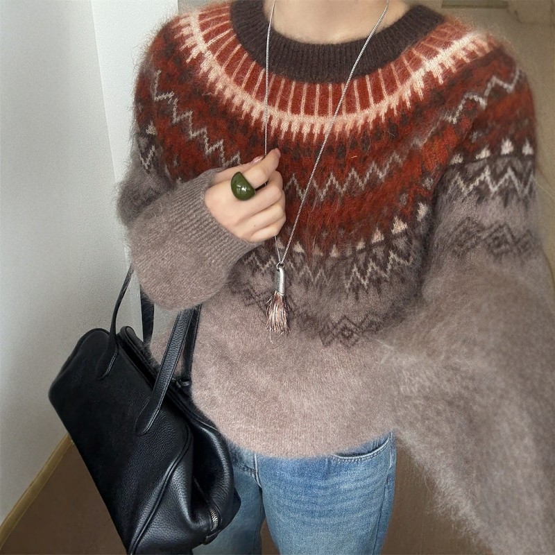 欧洲站2025冬季新款欧货费尔岛提花宽松慵懒套头羊毛针织衫毛衣女