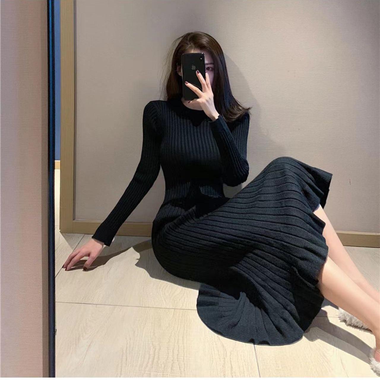 2025秋冬新款黑色针织连衣裙修身显瘦气质鱼尾长裙打底内搭毛