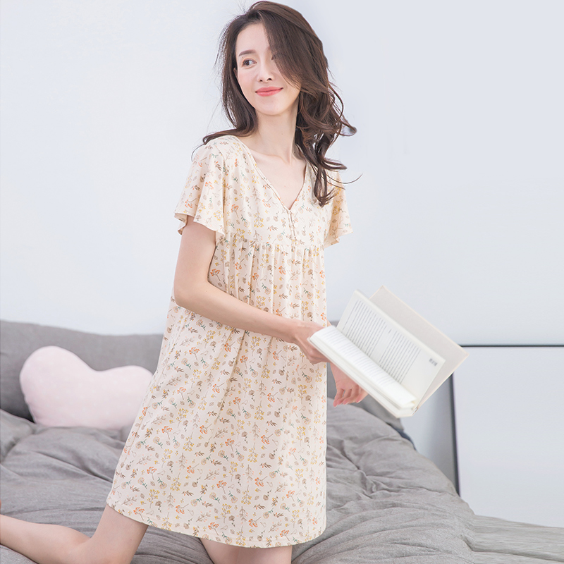 顶瓜瓜正品女士彩棉纯棉睡衣顶呱呱V领薄款舒适短袖家居服睡裙