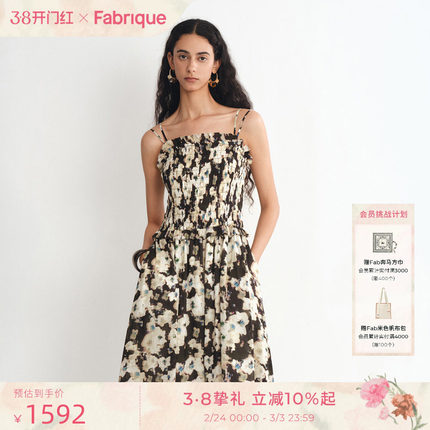 Fabrique法式优雅真丝桑蚕丝亚麻印花通勤吊带无袖连衣裙夏季