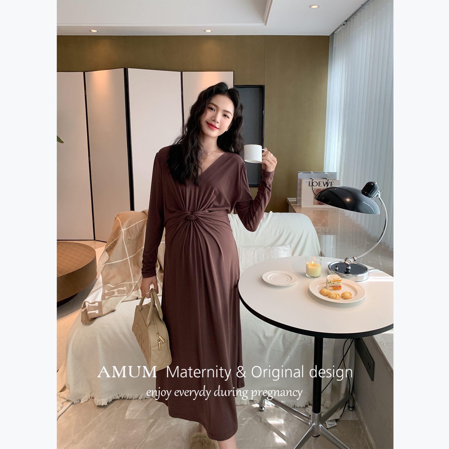 ◆AMUM孕妇装◆都市日记~V领交叉收腰纯欲高级黑色针织打底连衣裙
