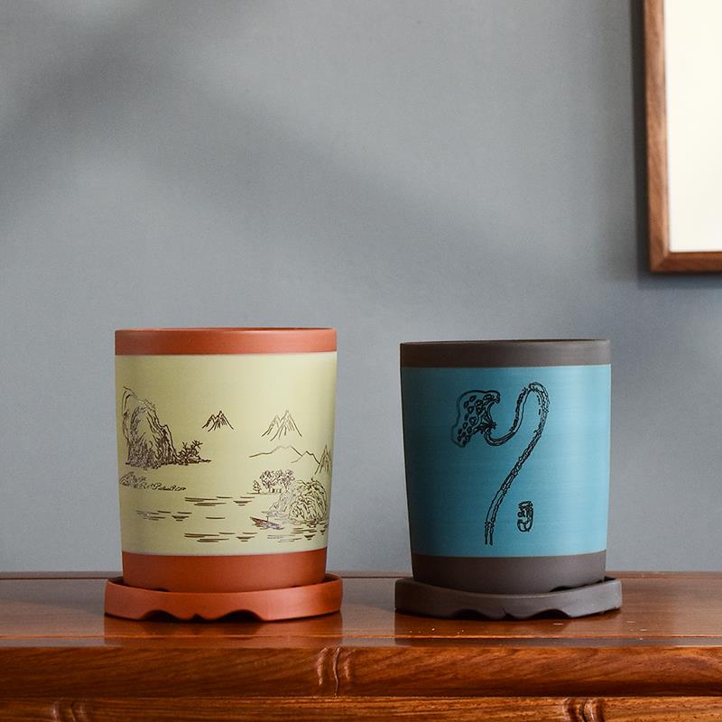 紫砂花盆陶瓷兰花专用透气蝴蝶兰绿植盆栽吊兰室内带托盘陶土盆小