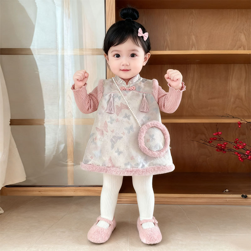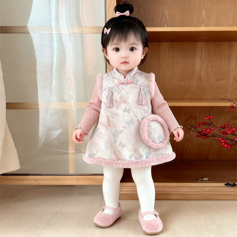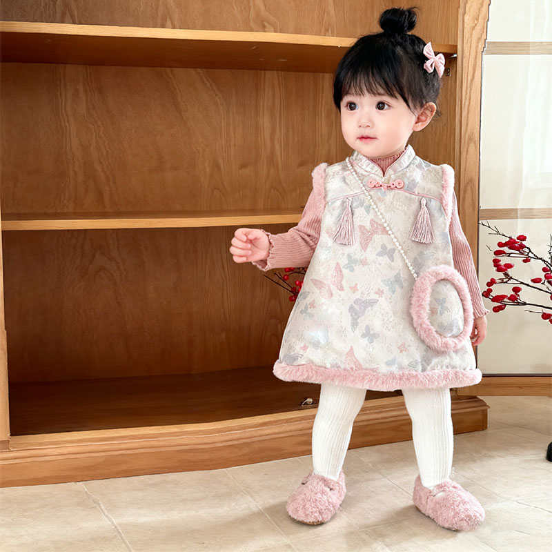女童连衣裙宝宝中式旗袍公主套装背心裙冬季夹棉暖拜年服周岁礼服