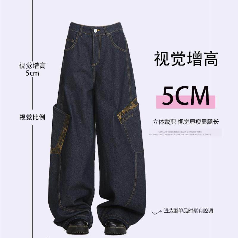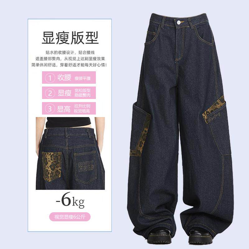 特大码女装豹纹拼接大口袋弯刀牛仔裤女胖mm美式宽松工装阔腿裤子