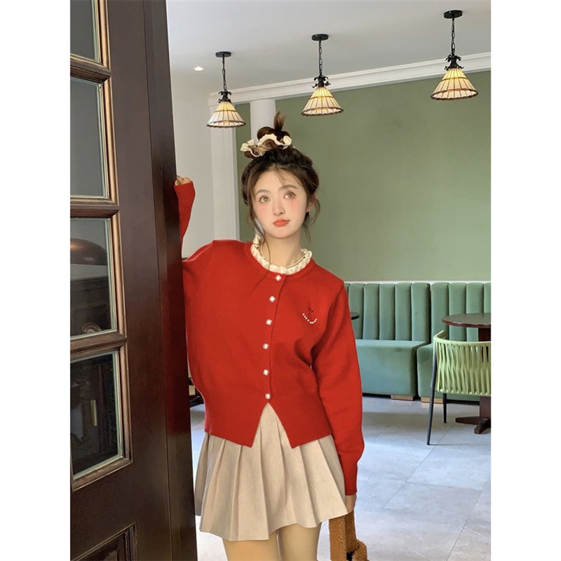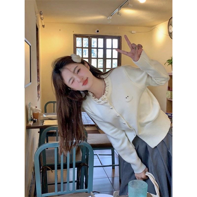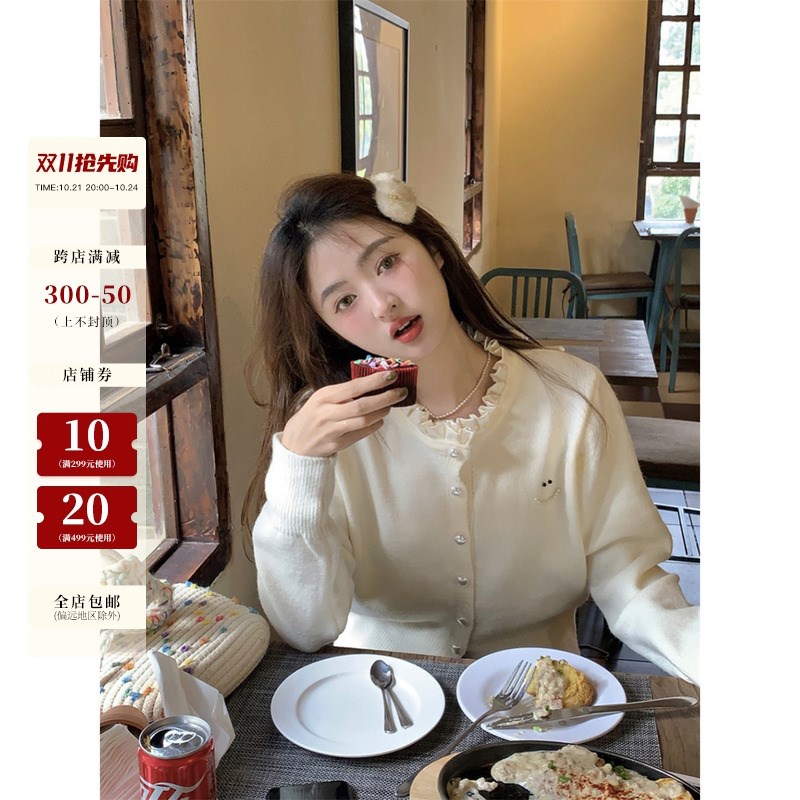 范雯雯 少女柔光 木耳边白色针织开衫女秋季甜美花边领毛衣外套