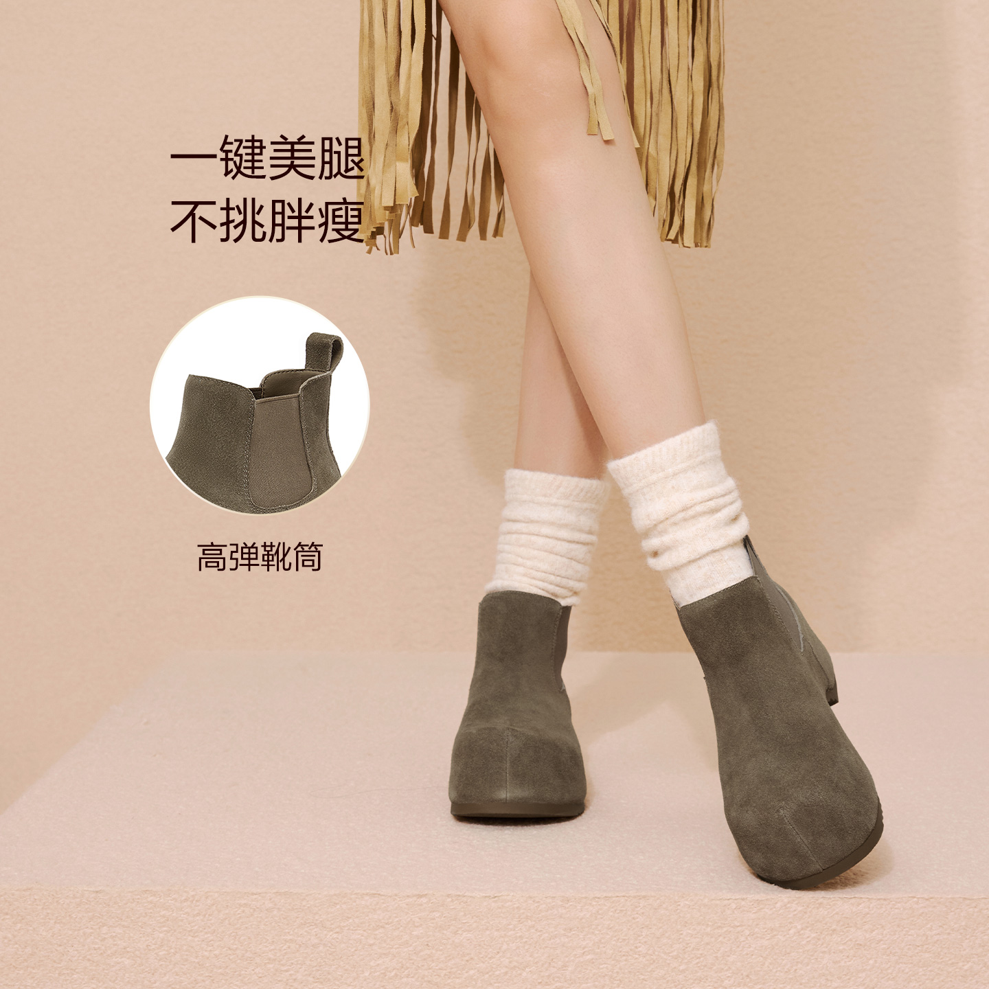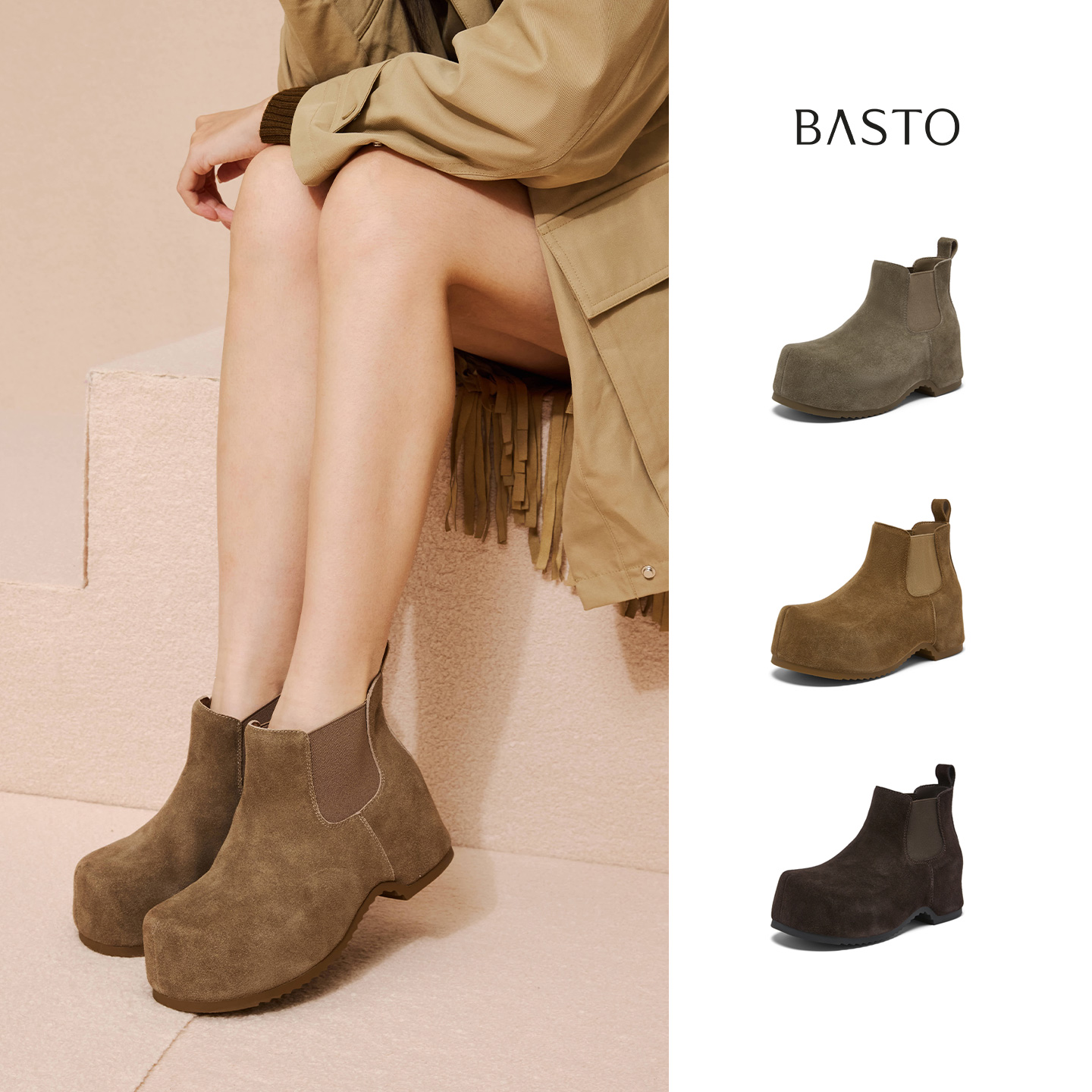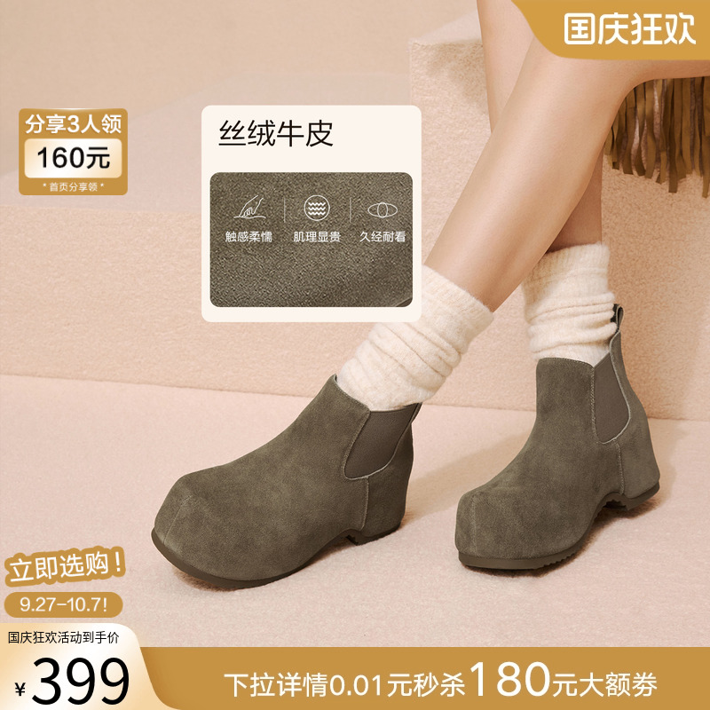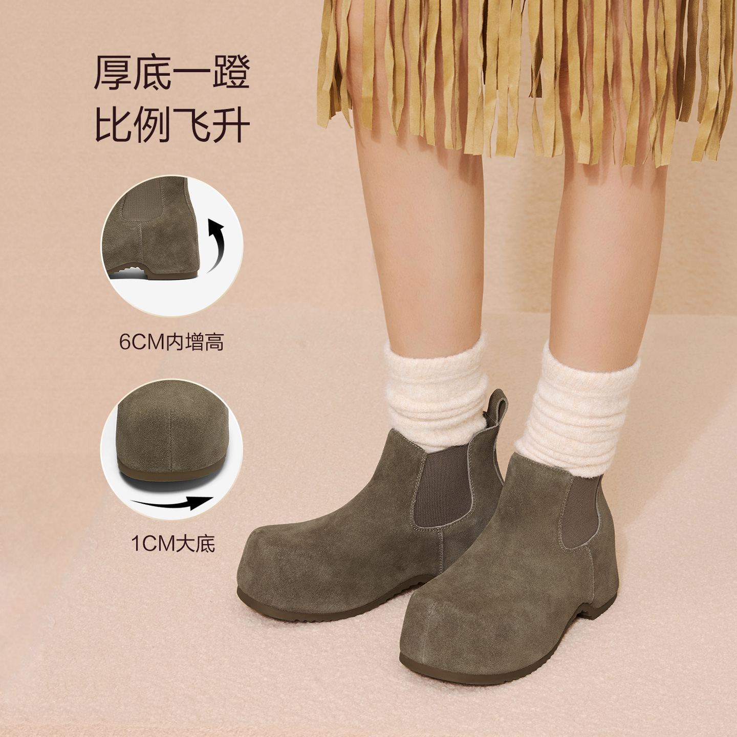 百思图2025冬季新款时尚复古真皮切尔西靴女厚底增高短靴W0652DD5