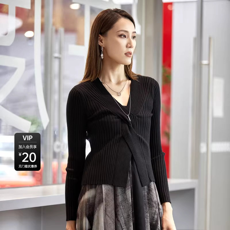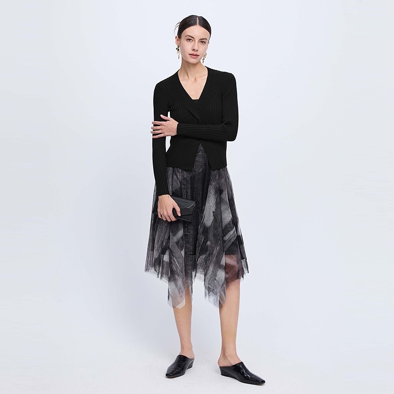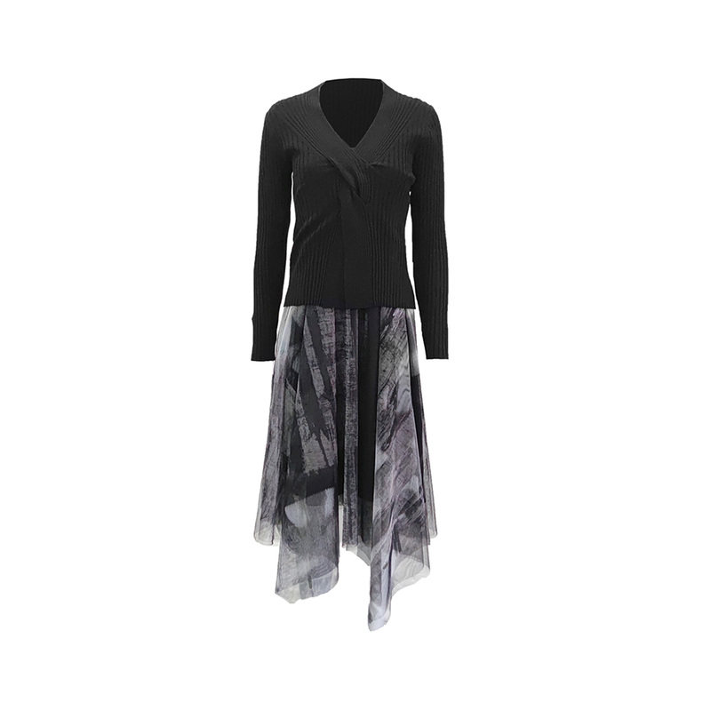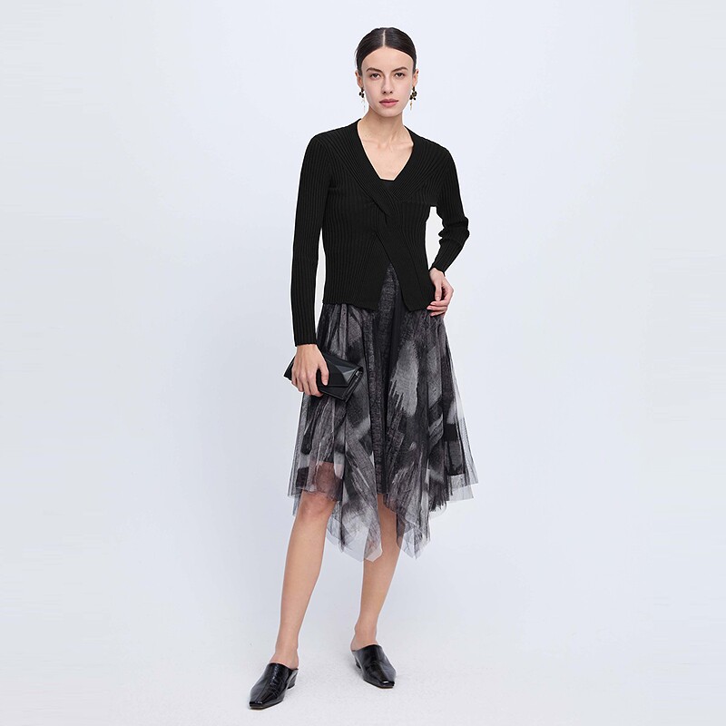 sdeer圣迪奥春装V领网纱针织两件套吊带连衣裙女S221Z1209