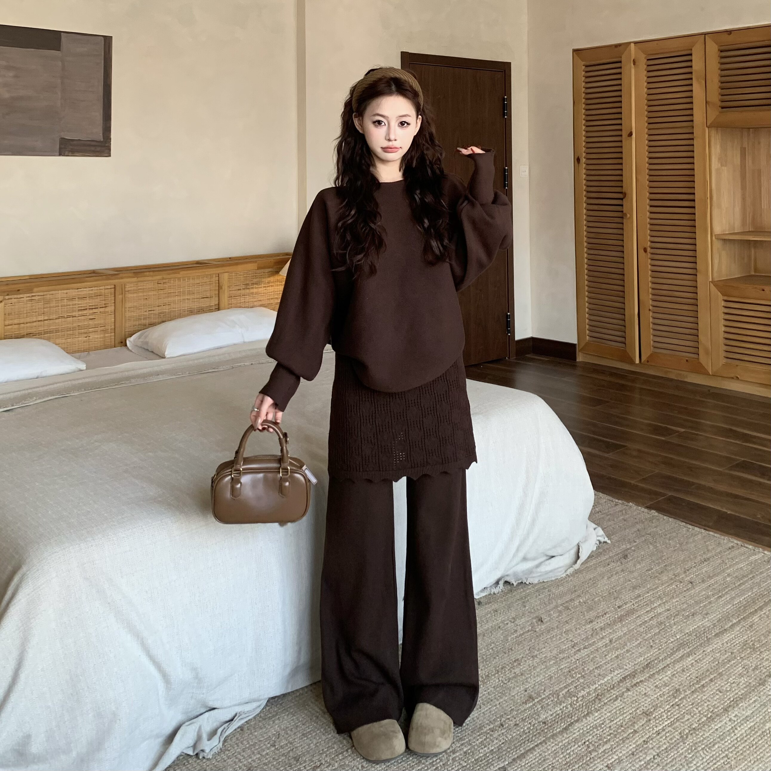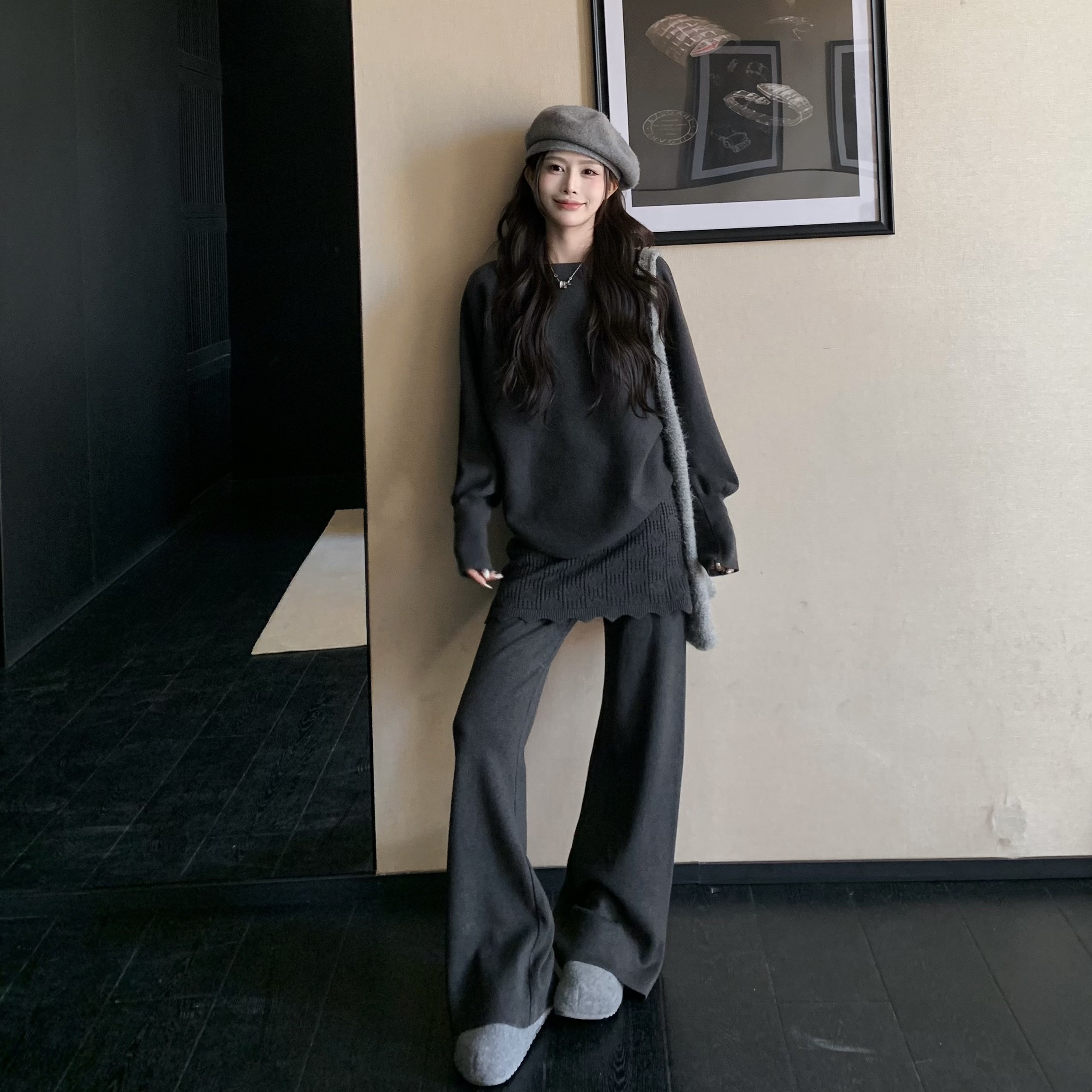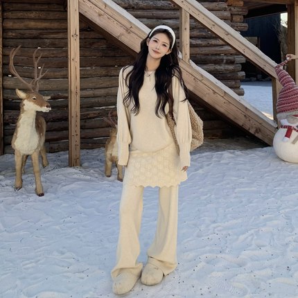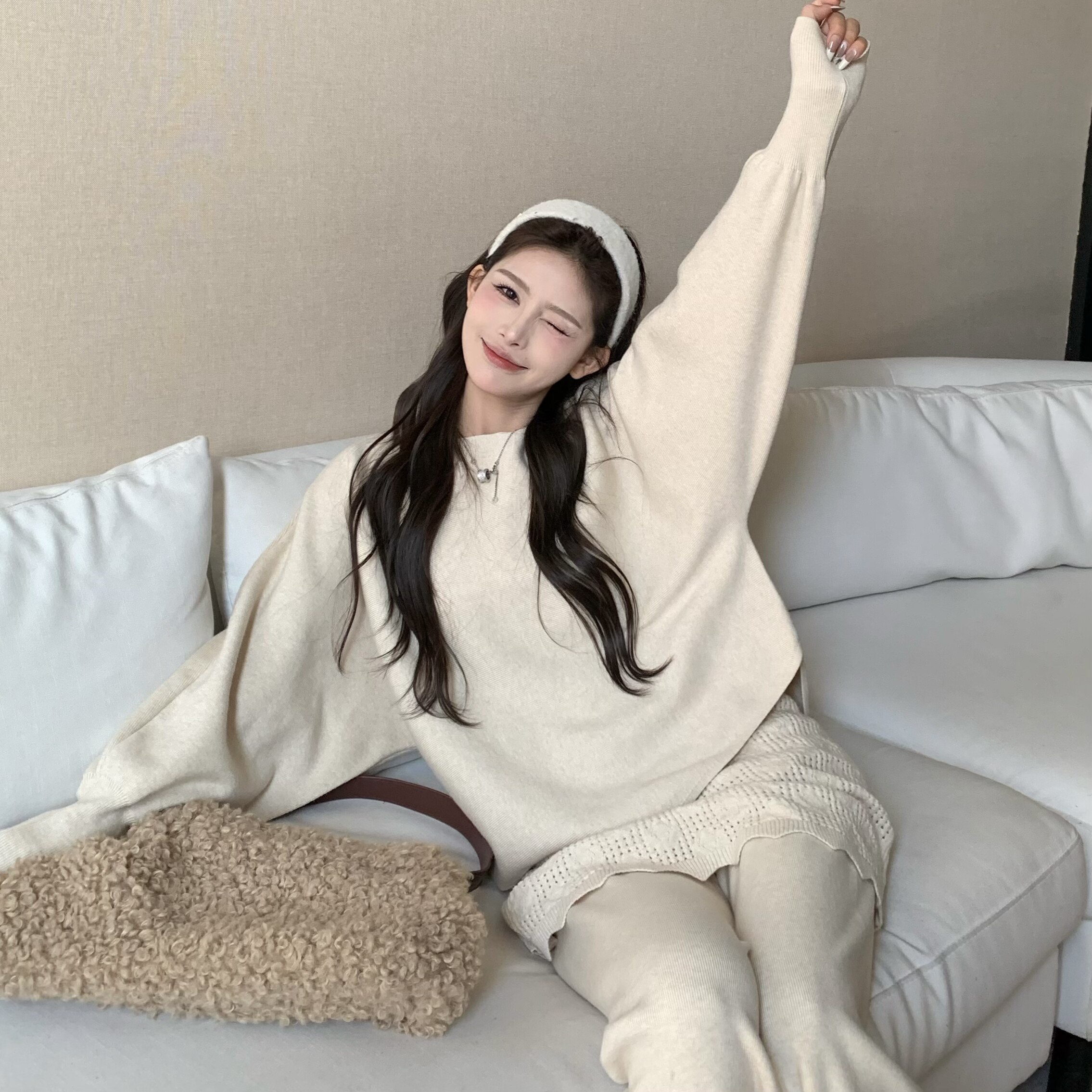 3MER哦哦三妹韩系温柔风套装女圆领针织毛衣春秋屁帘休闲裤两件套
