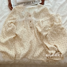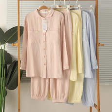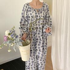 纯棉纱布睡衣女长袖春夏薄款全棉绉布家居服开衫碎白底碎花田园胖