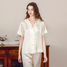 美标春夏重磅19姆米真丝睡衣女士套装100%桑蚕丝短袖蕾丝家居服