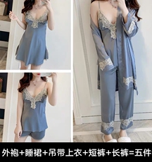 春夏睡衣女性感五件套冰丝绸薄款大码长袖睡袍睡裙吊带胸垫可外穿