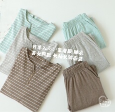 男女同款入お日系单棉木扣家居服条纹睡衣两件套宽松套装外贸春夏