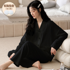 睡衣春秋款女士带胸垫纯棉黑色学生春夏天长袖大码薄款家居服套装
