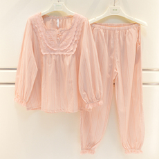 春夏季女士睡衣纯棉双层纱布薄款长袖套头宽松大码家居服两件套装