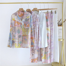 中国风棉绸女家居服套装薄款春夏长袖人造棉睡衣可外穿家居服豹纹