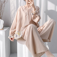 新款女睡衣人棉贡缎翻领长袖长裤家居服套装春夏薄款棉绸凉感冰丝