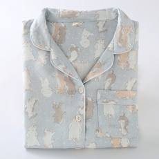 卡通兔睡衣女学生纯棉纱春夏薄款花边翻领开衫长袖长裤家居服套装