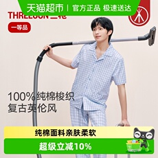 三枪家居服套装男士100%纯棉梭织格子短袖长裤春夏薄款睡衣可外穿