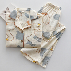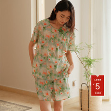 春夏薄款女士纯棉绉布胸垫睡衣免穿文胸双层纱布家居服套装卡通