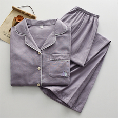 女纯棉双层纱布绉棉薄款长袖长裤睡衣家居服套装春夏空调房全棉