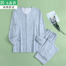 AB男士纯棉睡衣春夏中老年宽松长袖开衫长裤全棉空调服家居服套装