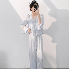 睡衣女春夏季两件套长袖长裤纯欲风蕾丝性感冰丝家居服套装冰雪丝