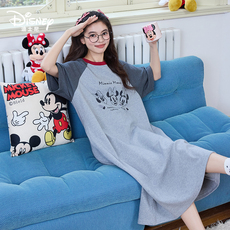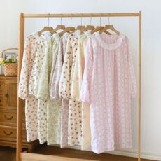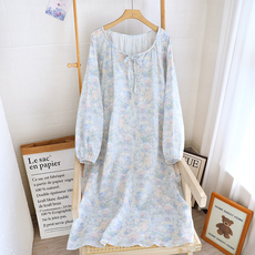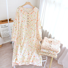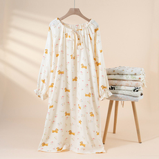 春夏季纯棉纱布睡裙女甜美卡通全棉薄款圆领长袖睡衣中长款家居服