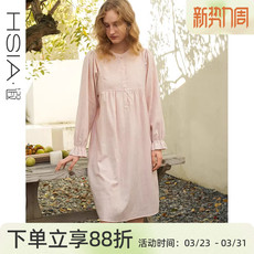 古卉睡衣女春夏针织网眼棉圆领睡裙立领长袖超薄短裙系带薄棉睡袍