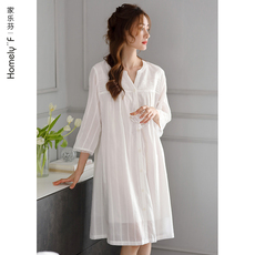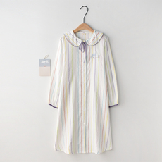 甜美彩条娃娃领刺绣睡裙女春夏季纯棉纱布双层薄款长袖家居服睡衣