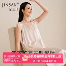 金三塔真丝长睡裙女春夏新品100%桑蚕丝蕾丝短袖圆领宽松过膝睡衣