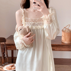 礼物女生美标春夏长袖真丝睡裙女复古法式蕾丝桑蚕丝绸睡衣家居服