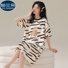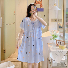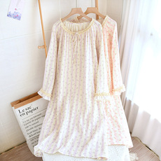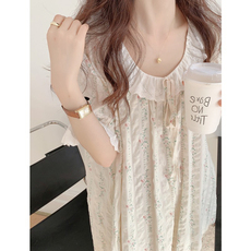 外贸原单春夏女纯棉双层纱布短袖睡裙中裙睡衣家居服日系宽松大码