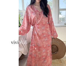 新中式国风复古红新中式睡裙女春夏新款度假长裙家居服绵绸连衣裙
