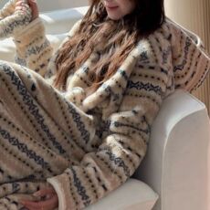 悦内半边绒睡衣女冬季加厚加绒珊瑚绒家居服红色本命年新年费尔岛