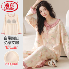 浪莎带胸垫睡衣女春秋款2026新款甜美长袖纯棉大码全棉家居服套装