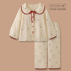 新中式国风盘扣睡衣女春秋季纯棉双层纱布复古提花长袖家居服套装