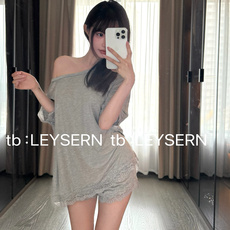 LEYSERN莫代尔性感睡衣韩版宽松斜肩蕾丝短袖T恤家居服套装纯欲风