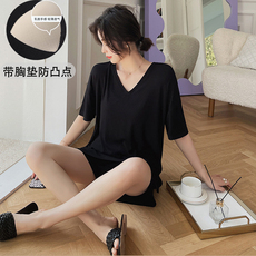 莫代尔睡衣女夏韩版短袖短裤半袖家居服套装纯色V领大码带胸垫薄