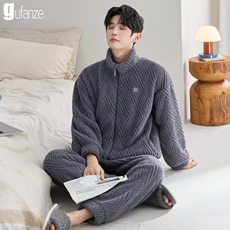 男士睡衣冬季珊瑚绒加厚加绒保暖秋冬款法兰绒家居服男款拉链套装
