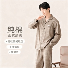 纯棉磨毛 男士全棉翻领家居服 保暖开衫睡衣裤 格子起居服 秋冬款