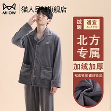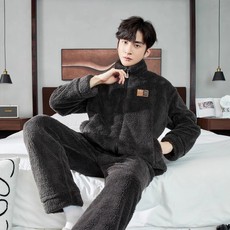 秋冬新款蓄热保暖雪花绒家居服可外穿男士简约休闲法兰绒睡衣套装