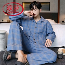 浪莎男士睡衣春秋季纯棉翻领长袖开衫休闲加大码青少年家居服套装