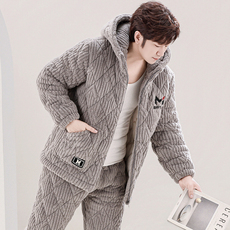 睡衣男士冬季珊瑚绒三层加厚法兰绒夹棉袄睡衣秋冬天款家居服套装