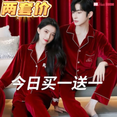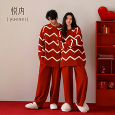 悦内半边绒情侣睡衣女秋冬季珊瑚绒保暖家居服男士红色本命年新年
