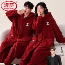 浪莎珊瑚绒睡袍女款冬季加厚加绒红色睡衣新婚情侣套装男士家居服