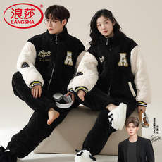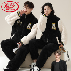 浪莎情侣睡衣冬款珊瑚绒夹棉三层加厚加绒保暖男女款运动风家居服