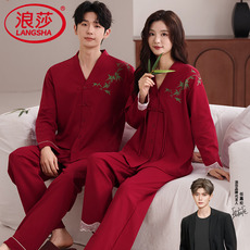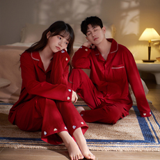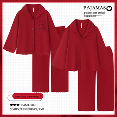 芬腾情侣睡衣春秋季长袖开衫女红色结婚本命年套装男士大码家居服
