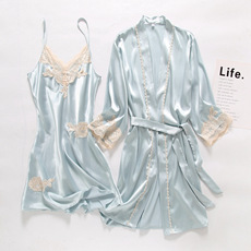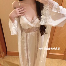 2022夏季新款冰丝睡衣女长袖新娘晨袍薄款性感蕾丝吊带睡裙两件套