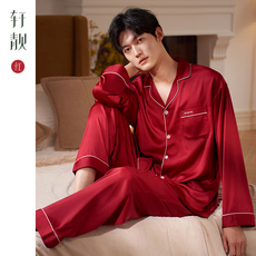 轩靓【冰丝】结婚睡衣男士春秋款秋季红色新婚仿真丝绸家居服套装