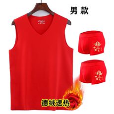 双面德绒红背心男秋冬本命年无痕发热保暖无袖V领结婚红色内裤袜